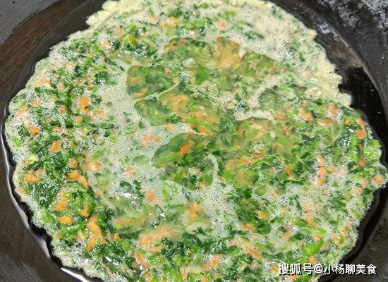 第五步:鍋中放入油,待油溫升高後,倒入蛋液,再把蛋液攤開,待底部那面煎至金黃後,再翻面煎至自己滿意的效果即可,一道又香又好吃的西洋菜煎雞蛋就做好了。