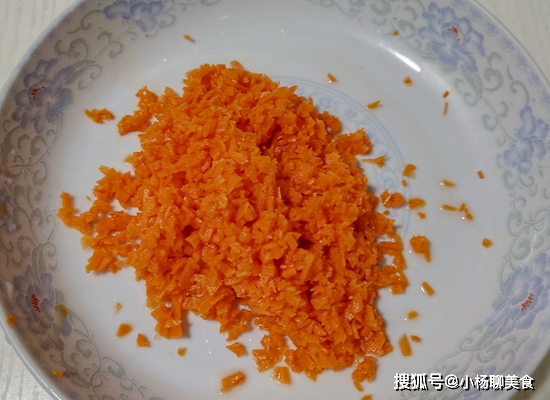 第一步:把胡蘿蔔去皮,再洗淨後切成片,接著切成細末,也可以用專門的擦絲器給胡蘿蔔擦成絲待用。