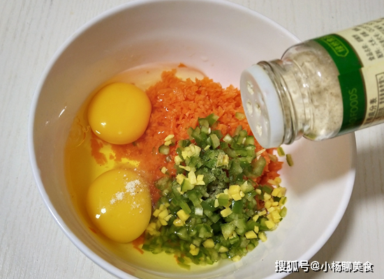 第三步:打入雞蛋,再把剛才切成絲胡蘿蔔還有青椒,生薑,一起加到雞蛋裡面,撒入鹽,還有一勺料酒,一勺胡椒粉,拌均勻即可待用,胡椒粉起到增香。