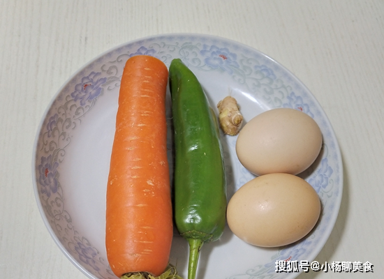 食材:胡蘿蔔半個,雞蛋兩個,青椒一個,生抽,食鹽,生薑,料酒,胡椒粉