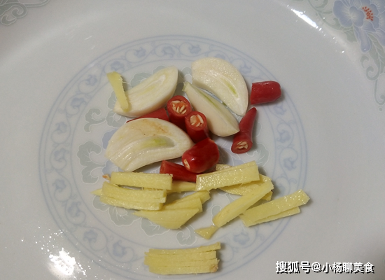 第二步:生薑切成絲,再把米椒切成段,蒜瓣切片,再裝盤備用。