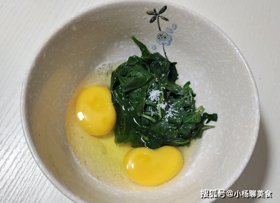 第三步:取一個大碗,打入雞蛋,再把剛焯好水的辣椒葉放入打散的蛋液中,加入少許鹽調味,最後充分攪拌均勻。