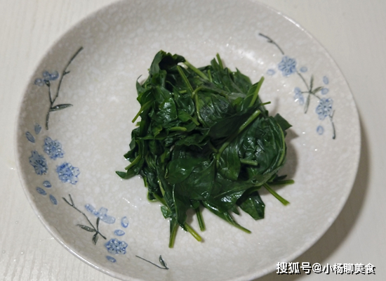 第二步:鍋中燒開熱水,把已洗淨的辣椒葉倒進鍋中,稍稍燙一分鐘後就撈出瀝幹水分,如果想要辣椒葉不含那麼多水分,可以把辣椒葉擠成團。