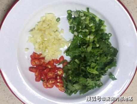 第三步,小米辣摘去根蒂後切成丁,香菜摘洗乾淨切成末,大蒜剝皮後切成蒜末,下麵調一碗料汁,一個碗中,放入蒜末,加上生抽、蚝油、白糖、食鹽和少許的清水;