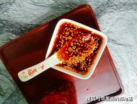 第四步,將其拌均勻後,辣椒粉放入一個碗中,加上點白芝麻和少許的食鹽,花椒、八角和香葉等凉油下鍋小火將其炸出香味,熱油澆在辣椒粉中拌均勻;