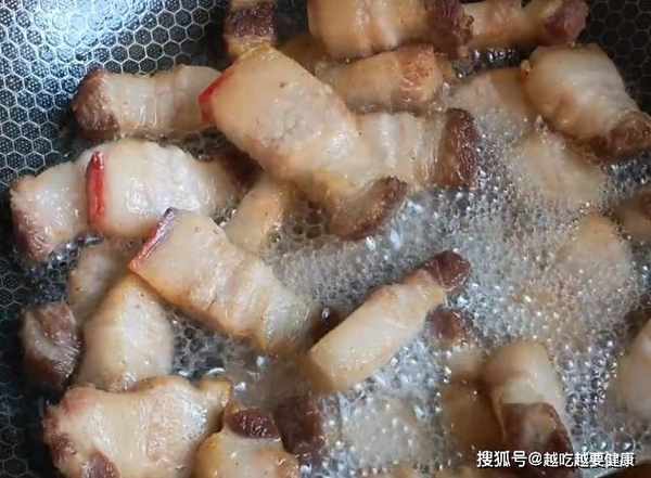 3.炒鍋燒熱放入凉油,然後趁油沒熱時我們放入五花肉,煸炒出油。一開始可能會有油崩的現象,我們需要蓋上蓋子。煸炒至四面焦黃,到處多餘的食用油,然將猪肉放入碗中備用。