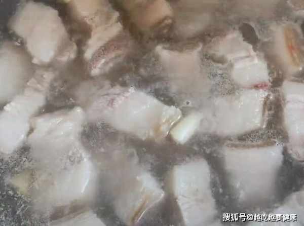 2.炒鍋中放入適量的清水,然後將五花肉放入裡邊,加入薑片兩個,料酒1勺,大火燒開。轉中小火煮至五分鐘,五分鐘後將五花肉撈出控幹水分。