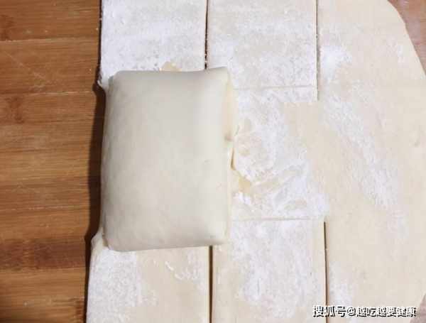 第四步,將麵團擀成一個長方形薄面片,用手將油酥塗抹在面片上,均勻一些,再均勻撒上少許食鹽,用刀從上往下切6刀,將切好的面片一塊一塊疊起來,捏住收口;