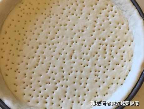 第七步,放入在9寸的披薩盤中,用手將其按平整,用叉子在上面紮孔;
