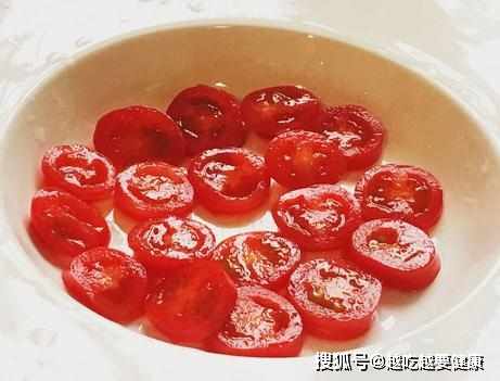 第四步,清洗乾淨的聖女果,切一刀,擠出汁水不要,再將果肉切成片;
