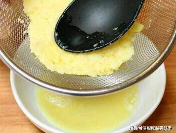 第二步,紅棗去核,掰成小塊,生薑切成塊,放入在原汁機中將其打碎,用篩網過濾下,取生薑汁用,生薑汁倒入在不粘鍋中;
