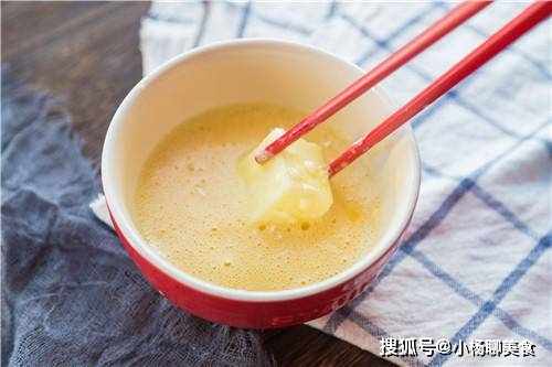 步驟2:接著將麵糊刮平,冷了之後蓋上蓋子,放入冰柜中冷藏,2小時之後就可以拿出。然後將奶凍脫模,直接倒扣在菜板上就會出來,接著將它們切成小塊備用。準備一個碗,打入2個雞蛋,接著將用筷子打散,放在一旁備用;在另外準備兩個碗,分別放入麵粉和麵包糠。