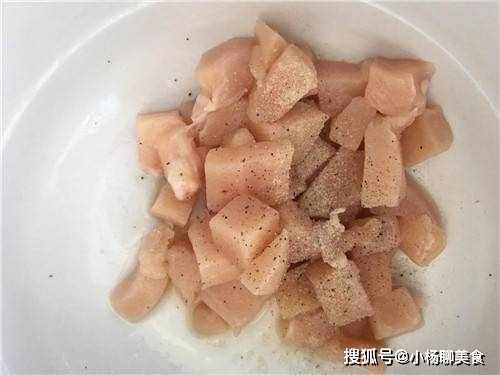 步驟1:雞胸肉放入水中清洗,反復的揉搓上幾次,洗乾淨之後就將雞胸肉切成肉丁,放入碗中。接著在碗中倒入適量的調料醃制,在雞胸肉碗中放入適量鹽、1茶匙料酒、半茶匙生抽、一茶匙白胡椒粉、半茶匙黑胡椒粉,然後快速的攪拌均勻,並且放在一旁醃制5-15分鐘。