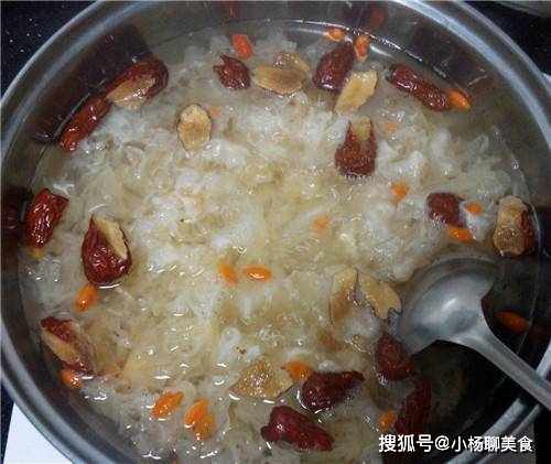 步驟3:準備一個砂鍋或者電鍋,接著將鍋清洗乾淨,並且將銀耳下鍋煮上1小時之後,將百合、蓮子一起下鍋,接著在煮上一小時,這時候銀耳已經出膠了,就將紅棗下鍋,煮上10分鐘之後就倒入冰糖,將冰糖煮化之後就關火,冷一點就可以出鍋吃了。