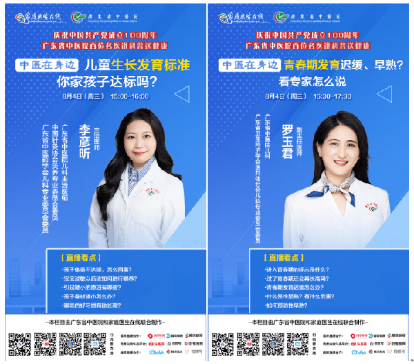 為了提高家長的科學育兒觀念和知識,廣東省中醫院聯合家庭醫生線上推出兒童青少年生長發育專場直播活動,邀請了廣東省中醫院兒科副主任醫師羅玉君、主治醫師李彥昕,於8月4日15:00-16:00、16:30-17:30這兩個時間段進行直播,為大家科普0-6歲兒童生長發育、青春期發育、身材矮小、寶寶過敏等相關知識,歡迎大家準時收看!