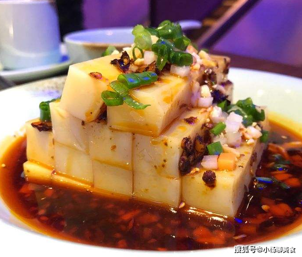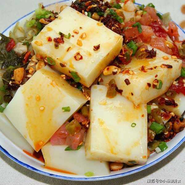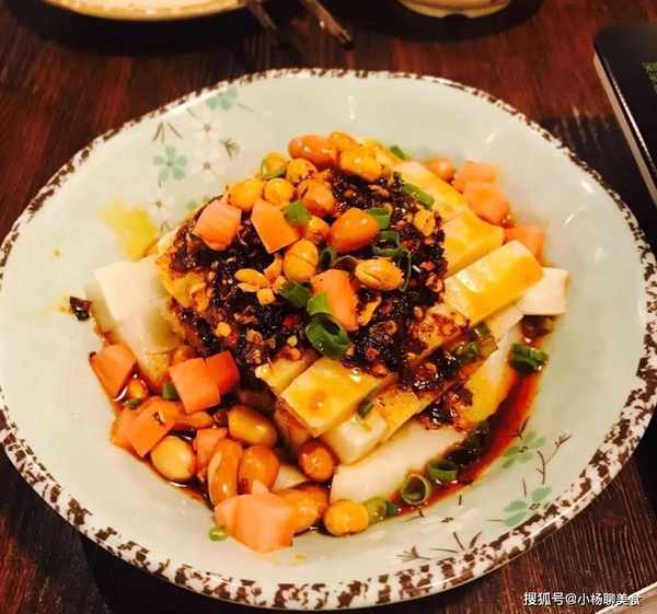步驟五,緊接著,要把調好的汁淋在米豆腐上,等到食材入味了,就能裝盤了。