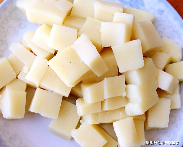 步驟一,食材備好後,我們要把買回來的米豆腐用流動水沖洗下,把米豆腐控水後,放在案板上,切成塊狀。
