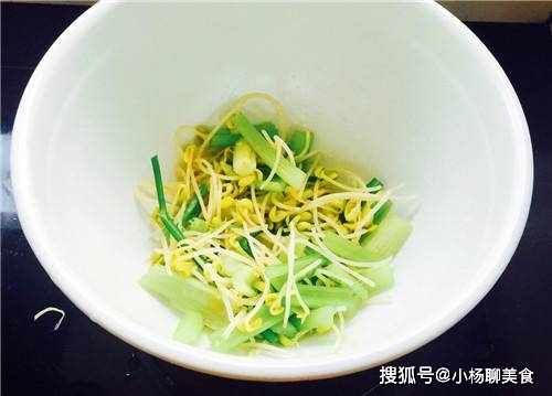 步驟2:醃制魚片的時候處理配菜,拿出青紅椒,洗乾淨之後就將辣椒切成圈,放入碗中,接著倒入半茶匙鹽,並且快速的攪拌醃一下。然後將黃豆芽放在水中清洗乾淨,萵筍削掉皮之後洗乾淨,並且切成萵筍絲。接著在鍋中燒上水,加上半茶匙鹽,燒開之後放入黃豆芽,焯熟就撈出;然後萵筍絲下鍋,焯熟備用。
