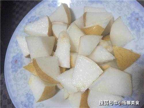 步驟2:然後拿出雪梨,先將雪梨打濕,接著在梨身上撒上鹽,並且開始摩擦,將梨身上的蠟都摩擦下來之後就將梨放在流動水下沖洗幾次。接著將梨放在案板上,並且快速的切成塊,放在一旁備用。最後將枸杞和冰糖拿出備用,枸杞泡上10分鐘後撈出備用。