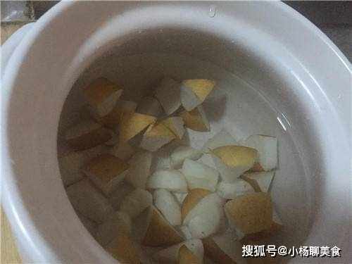 步驟3:取出砂鍋,簡單的清洗一下後倒入水,接著將梨、紅棗下鍋煮,先大火煮開,然後用中小火煮,40分鐘之後就倒入冰糖、枸杞,再次煮上5分鐘,就可以關火出鍋了。最後煮的時候可以用勺子不斷的攪拌下,爭取讓冰糖子啊關火前融化。