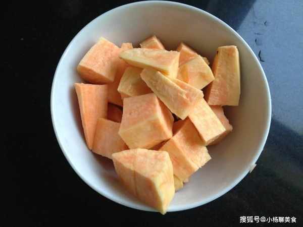 步驟三,這個時候,我們再把買回來的紅薯外皮去除,用清水沖洗後,切成塊狀,放在盤中。