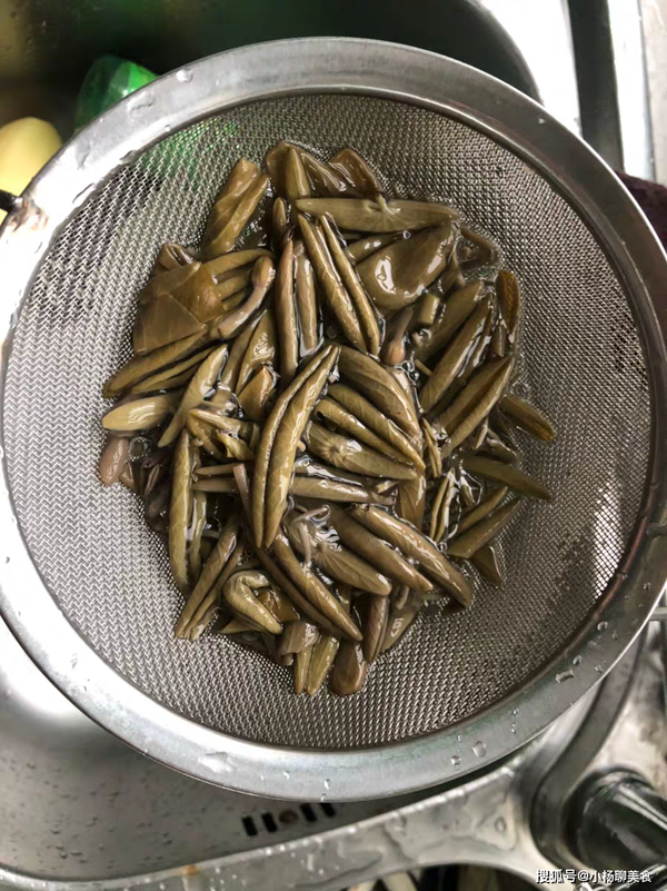 步驟一,食材備好之後,我們把蓴菜放在漏勺上,這樣清洗的時候,避免灑落在水池中,把蓴菜放在流動水下麵多沖洗幾遍。