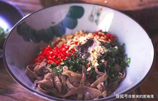 然後順著毛肚上面紋理的方向,一片一片的撕下來,撕成薄片。然後把毛肚控幹水分,開水下鍋,焯水一分鐘後撈出,切成絲備用。此時的毛肚口感剛剛好,脆嫩爽口,鮮嫩有嚼勁