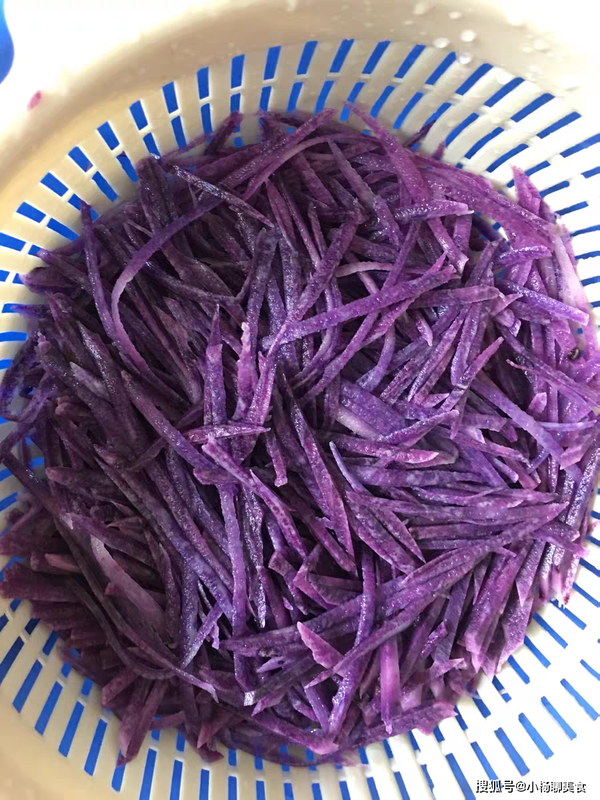 步驟一,食材備好之後呢,我們把買回來的紫洋芋表皮清理下,把紫洋芋放在清水內多沖洗幾遍,瀝水後,現切成片狀,再切成絲。