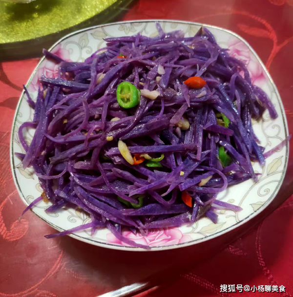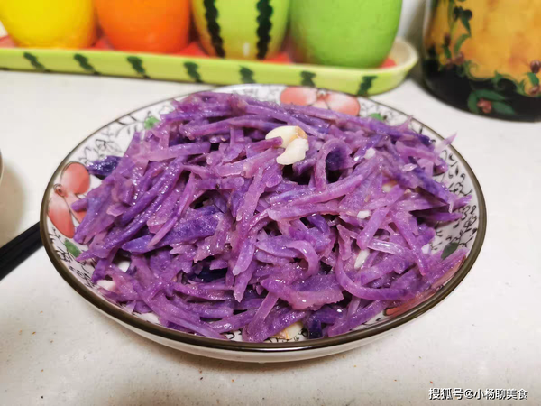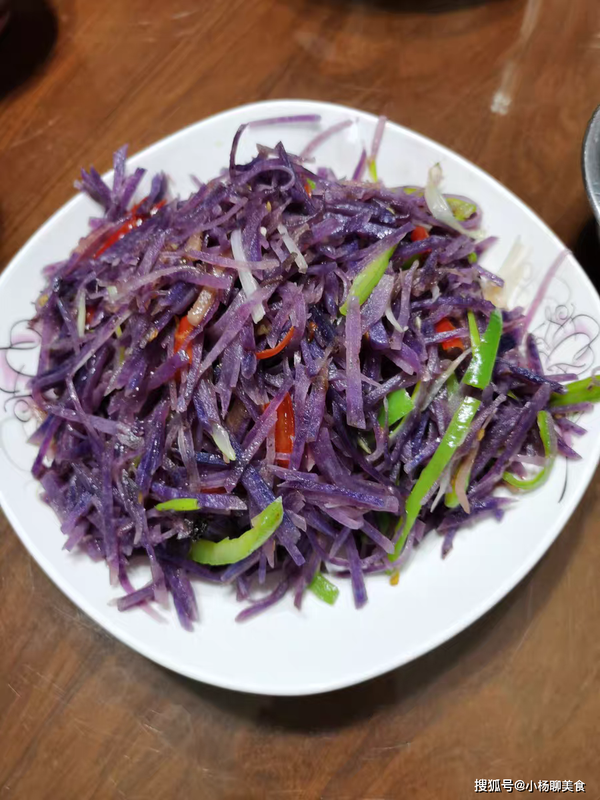 這道清炒紫土豆絲的顏值是不是很高,遇到的話不要錯過呢,紫洋芋營養豐富,它的外表很驚豔,吃起來更是可口,清脆,它含有豐富的花青素,女孩子都知道花青素的作用,常吃些對肌膚特別好,幫助清理自由基,還能减少黑色素的形成,是一道養顏護膚的好食材,皮膚不好的人常吃些,能够保護皮膚,緩解下暗黃,粗糙等情况。