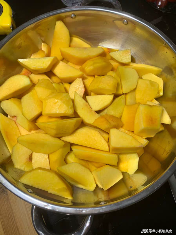 步驟三,把切好的黃桃放在鍋中,倒上適量的清水,冰糖放入鍋中,大火煮15分鐘左右。