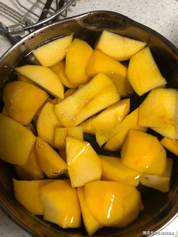 步驟二,將浸泡的黃桃再用清水沖洗幾遍,切成塊狀放在清水內。