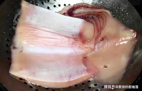 3、經過堿水泡發之後的幹魷魚馬上就變得跟鮮魷魚一樣,肉質肥厚,這時候將其取出,用清水沖洗乾淨,瀝幹水分之後即可對它進行烹飪啦!