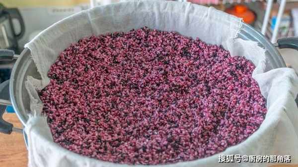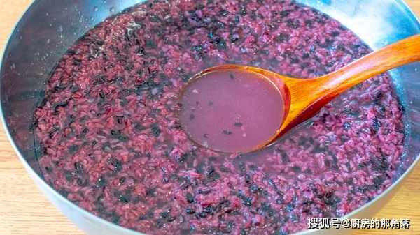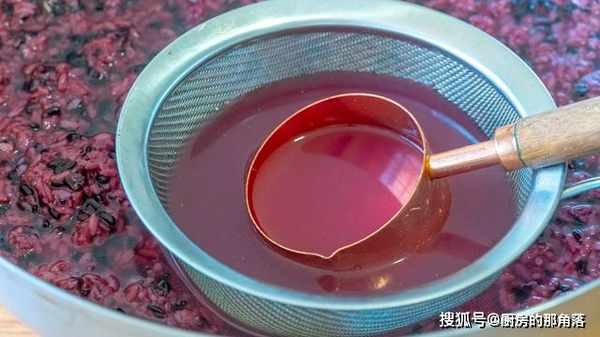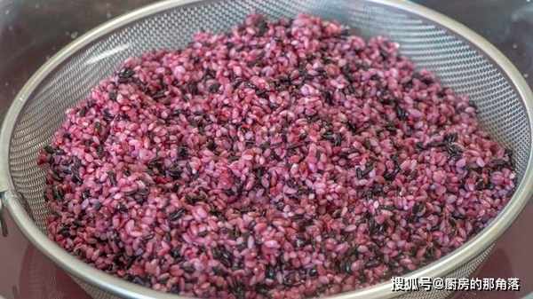 2、第二天糯米也被染色了,後期做出來的酒釀顏色也會更漂亮,泡好的米先把水倒掉,然後再加清水沖洗一遍,接著倒出來瀝幹水分。