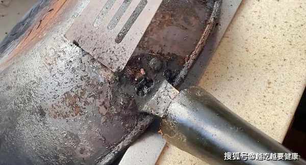 3.將鍋底的每個部分都燃燒一遍後,這個時候我們關火就可以啦。炒鍋鍋底被燃燒過後,就變成灰白色了。這個時候再借助家裡的鏟子給她用力的輕輕一鏟,這個鍋灰就很容易鏟下來啦。