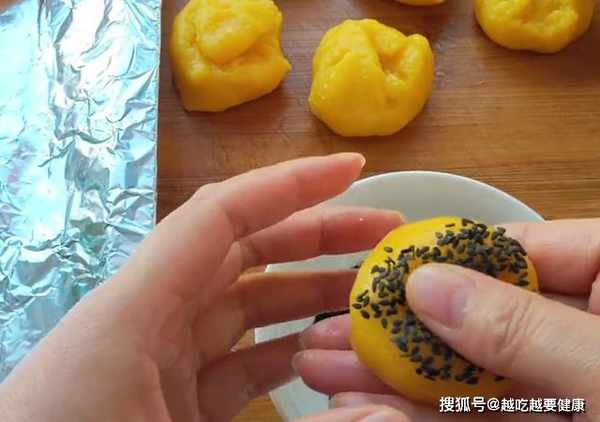 5.醒好的麵團,我們將其揉成長條,然後將其分成大小均勻的八個小劑子,然後取其中一個小劑子揉圓裹上一面的黑芝麻,從中間將其扣開。做成一個像碗一樣形狀,一次將這八個小劑子處理好。