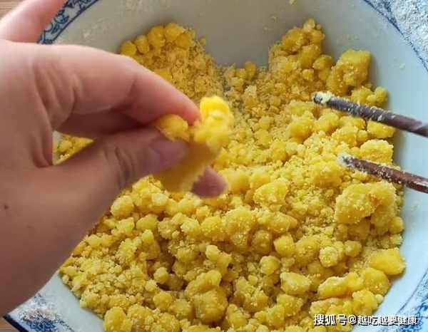 4然後將製作好的雞蛋,倒在油面中將其攪拌均勻後,用手揉成光滑麵團放置一旁,醒發十分鐘備用。