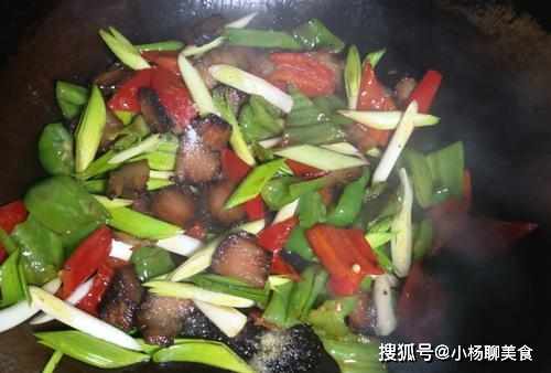 2、臘肉清洗之後,我們將其切製成片狀,辣椒清洗之後也都切制一下,青蒜則是切製成段狀待用。起鍋燒油,先炒辣椒,隨後將辣椒推倒邊上,我們放入臘肉翻炒,之後一起炒勻,翻入青蒜,再加點生抽入味,就可以裝盤食用了。