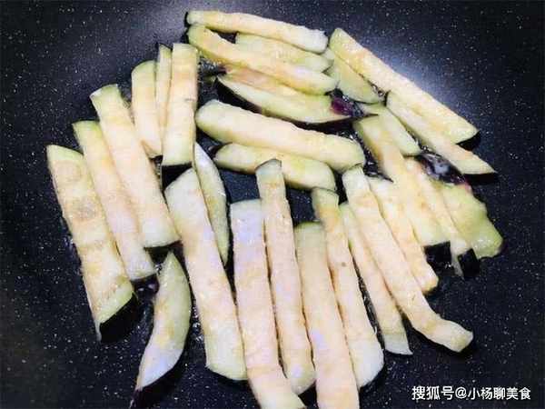 然後倒一些玉米澱粉下去,讓每一根茄子條都沾上玉米澱粉,接著起鍋燒油,把茄條放下去炸,開中火炸至金黃即可,撈出來瀝幹油鍋裏剩下的油就給蔥花爆香。