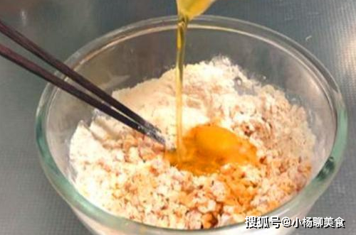 往裡面加入400g的麵粉,建議最好是用高筋麵粉,這樣做出來的口感好一些,然後再打入一個雞蛋,用筷子去攪拌,攪拌成面絮之後,我們加玉米油25g,攪勻之後待用。