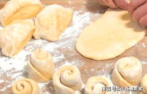 準備一個小碗,裡面加5g酵母粉,隨後加溫牛奶半袋,融化之後加入麵粉中,一起揉成軟一點的麵團,最後密封發酵,等發酵成兩倍大小之後,我們將其取出,搓成長條之後切成8個大劑子。