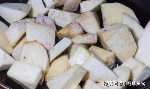 2.架鍋燒熱,添入適量的食用油,隨後將脚板薯塊丟入鍋中翻炒幾下,炒至微微焦黃後便關火。