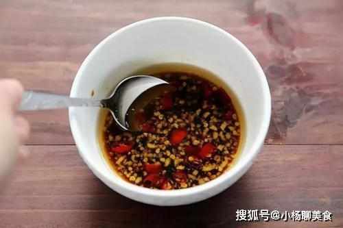 2、準備小碗一個,放入辣椒末、薑末、蒜末,然後再加入一勺陳醋、兩勺生抽、少許香油、適量辣椒油攪勻,這醬汁就算是製作完成了。