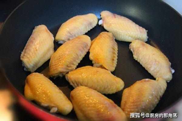 3、首先,咱們鍋熱加入少許底油潤鍋,接著著咱們將熱油倒出,將醃制好的雞翅,下入鍋內煎至兩面金黃,大家注意,雞翅只有煎至面金黃的時候,才會更加入味好吃,這一點,咱們大家要牢記,接著將其煎好後盛出備用。