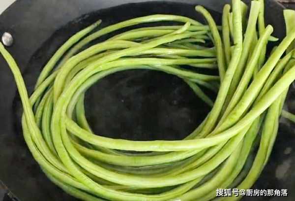 2.豆角300克,將去掉根部,炒鍋中加入適量的清水大火燒開,水開後準備好的長豆角放入裡面,大火汆燙兩分鐘。這一步的目的是給豆角斷生,做出來的豆角餡包更加入味。