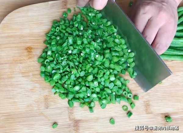 3.汆燙好之後我們立即將其撈出,放入凉水中過凉備用。過凉之後我們將豆角改刀切碎。香菇六個將其洗淨,然後將其切成碎末備用。