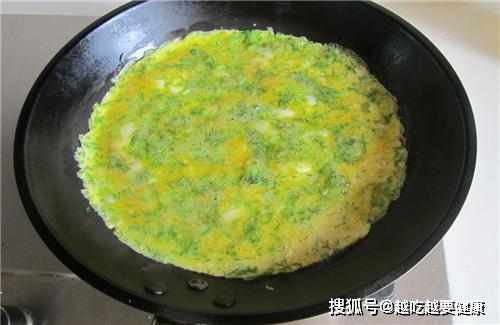 起鍋燒油,茴香雞蛋液倒入鍋中,開中小火,免得火的溫度太高導致雞蛋液糊掉,等底部凝固之後翻面即可。