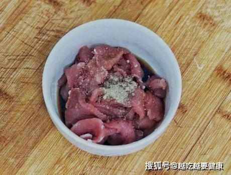 第一步,猪瘦肉切成薄薄的片,放在容器中,加上澱粉、鹽、料酒、胡椒粉和醬油,用手抓拌均勻醃制一會;