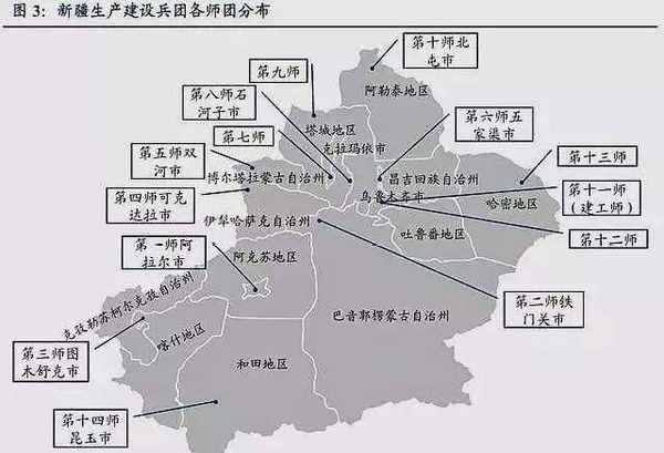△新疆生產建設兵團各師團分佈