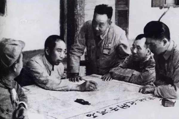 △1950年7、8月間,王震(左二)、陶峙嶽(中)等研究石河子墾區規劃