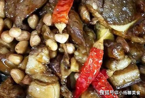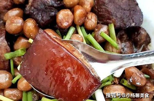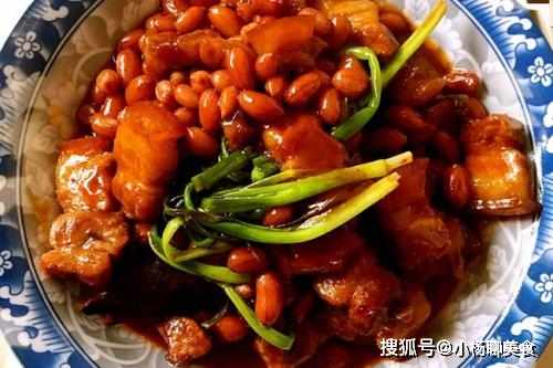 4、鍋中加入花生,與猪肉一起翻炒,炒熟之後放醬油、蚝油、幹辣椒入味,最後將所有食材放入電鍋,上面再擱點大葱,加熱半小時之後即可享用。